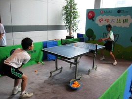 小朋友們於小型乒乓球枱上切磋技術