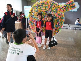 逾百名小朋友都十分喜愛盛載數千個乒乓球的大型球拍,紛紛圍著面前合照。