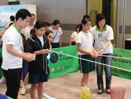 圖一 在恒生義工陪同下,小朋友積極參與各式各樣的乒乓球攤位遊戲,贏取豐富獎品。