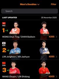 34歲的黃鎮廷經驗豐富,20歲的陳顥樺活力十足,兩人一拍即合,連挫韓國、日本及中國強敵,成功超越法國勒布倫兄弟及國家隊王楚欽/林詩棟,首登「世一」。